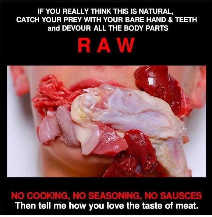 Now let’s compare humans to predators found in nature. An actual predator runs around in the woods naked, chases after their prey, grabs the animal with their teeth, kills the animal in their mouth, and eats the animal raw. Predators do this because they have to in order to survive.