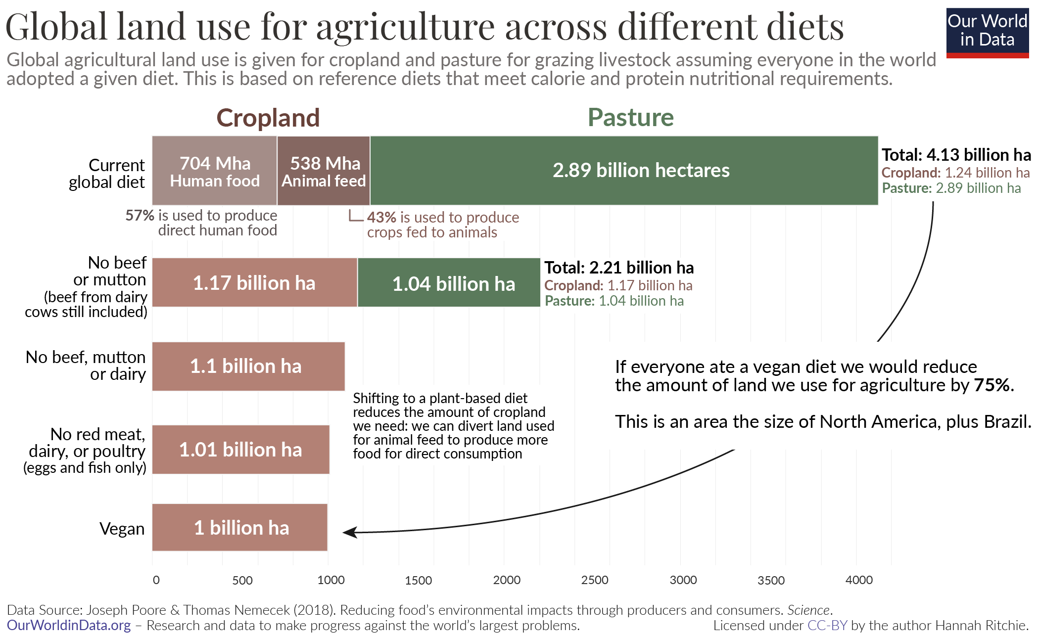 So let’s say you’ve reviewed the data here and watched the videos, and now you realize that yes, a meat eater’s diet does in fact cause substantially more animal deaths than a vegan’s diet. The next thing you may ask is, “So if everyone were to go vegan, would we even be able to grow enough food? Do we have enough land to do so?” As I mentioned earlier in this article, most crops grown today are for livestock (in the US, feed crops take up roughly 75% of farmland, and in the EU, it’s 71%). So the answer is not only “yes”, but the data shows that we could feed the entire human population a vegan diet using just 25% of the land we currently use for agriculture. So if the world went vegan, we could grow enough food using just 25% of the land we use now for agriculture, then we could take the remaining 75% of the land and reforest it, which would have amazing benefits for local wildlife and the environment. And to bring this back to crop deaths, less farmland also means fewer crop deaths, so the best way to reduce crop deaths is to go vegan.