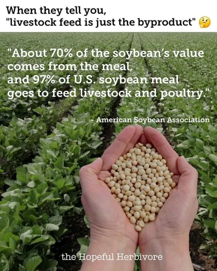 One of the common anti-vegan responses to the information above is to claim that most soy is not actually grown for animal feed, and that the percentages are high because it includes the non-human edible soy byproduct that animals eat. Animals do indeed eat the byproducts, but that doesn’t account for why the percentages are so high. If you don’t believe me, let’s see what the American Soybean Association has to say:
