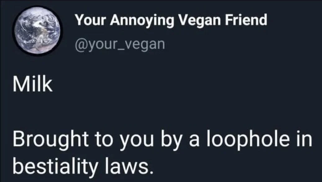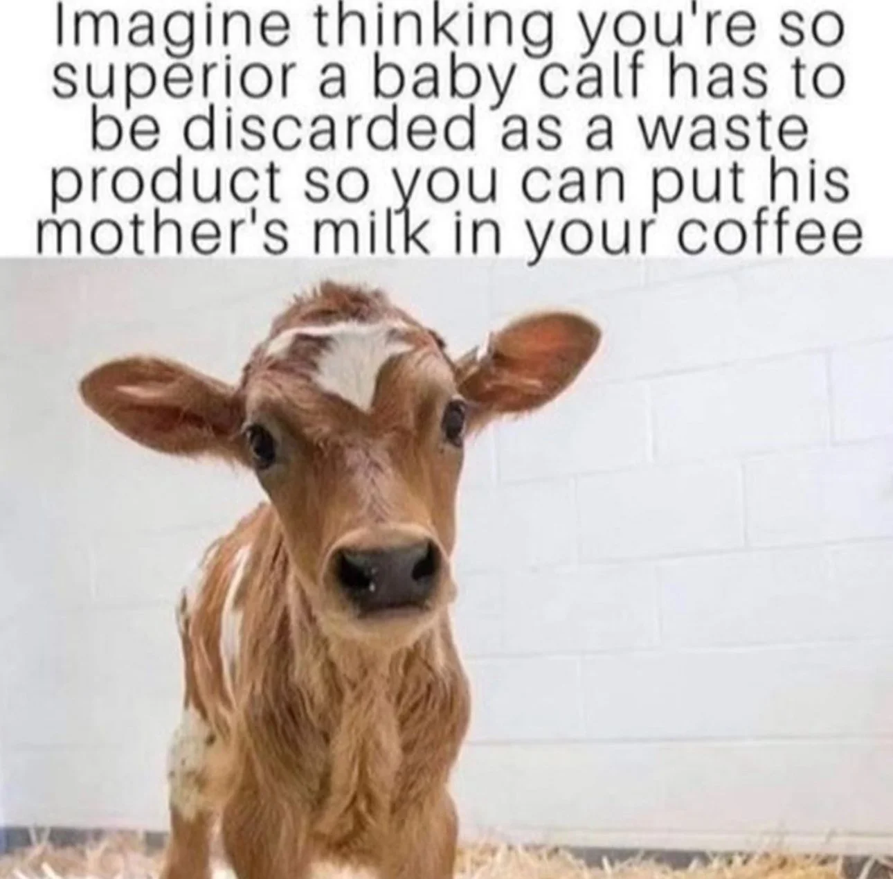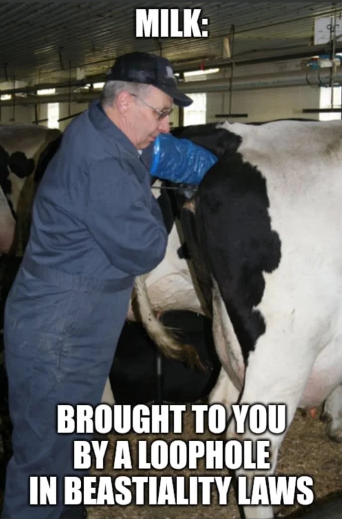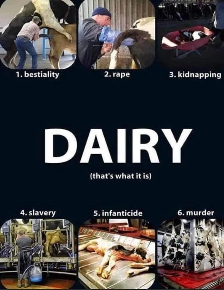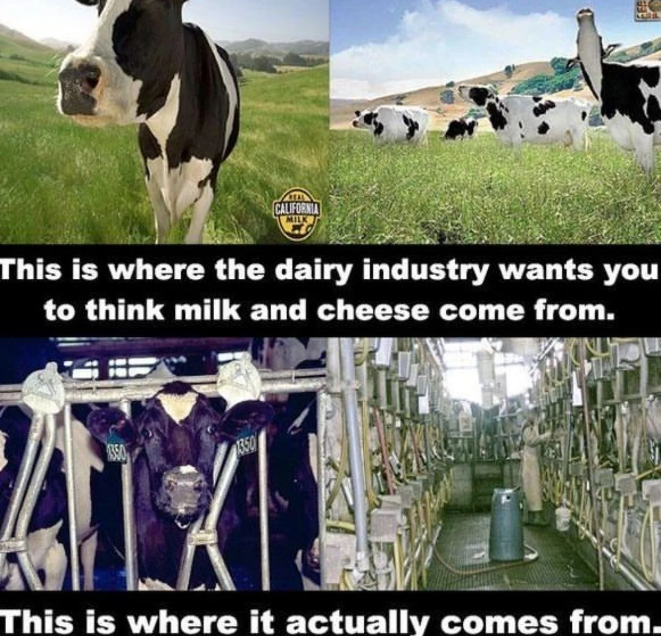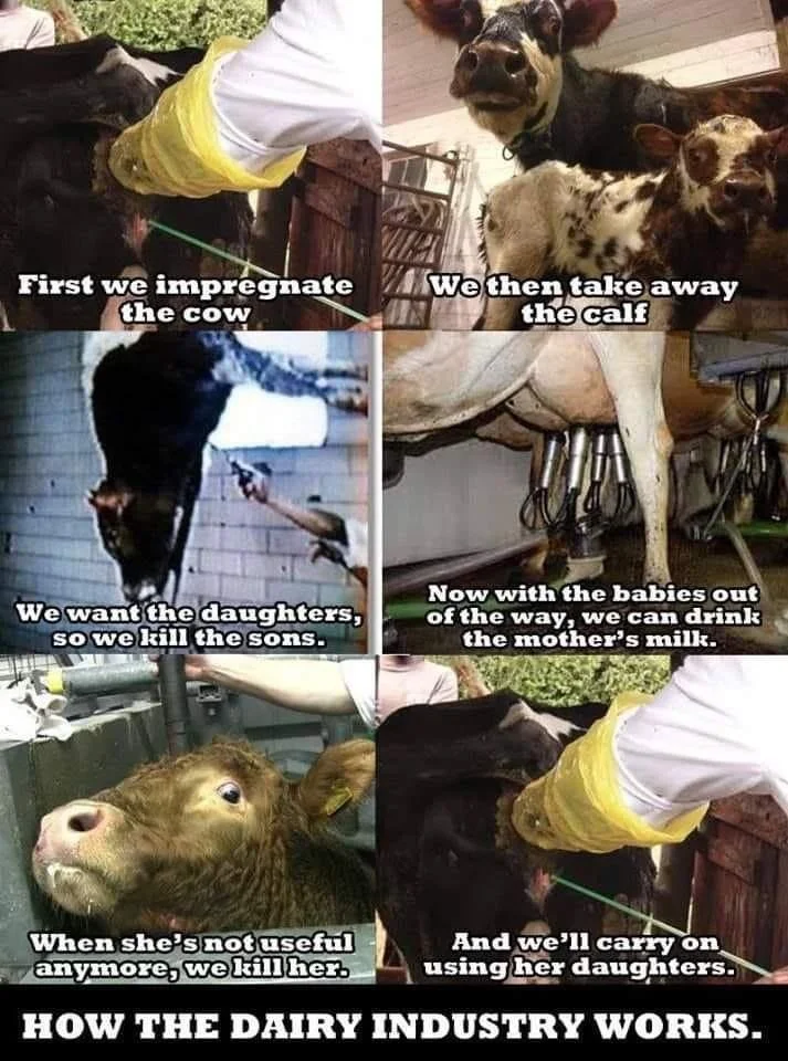 Cows don’t produce milk because they’re cows. They produce milk for the same reason humans do - because they’re mothers. In the dairy industry, cows are forcefully impregnated via a device the industry calls the “rape rack”, then when their babies are born they’re immediately taken away, so the farmers can hook the new mothers up to machines to take all of their milk.