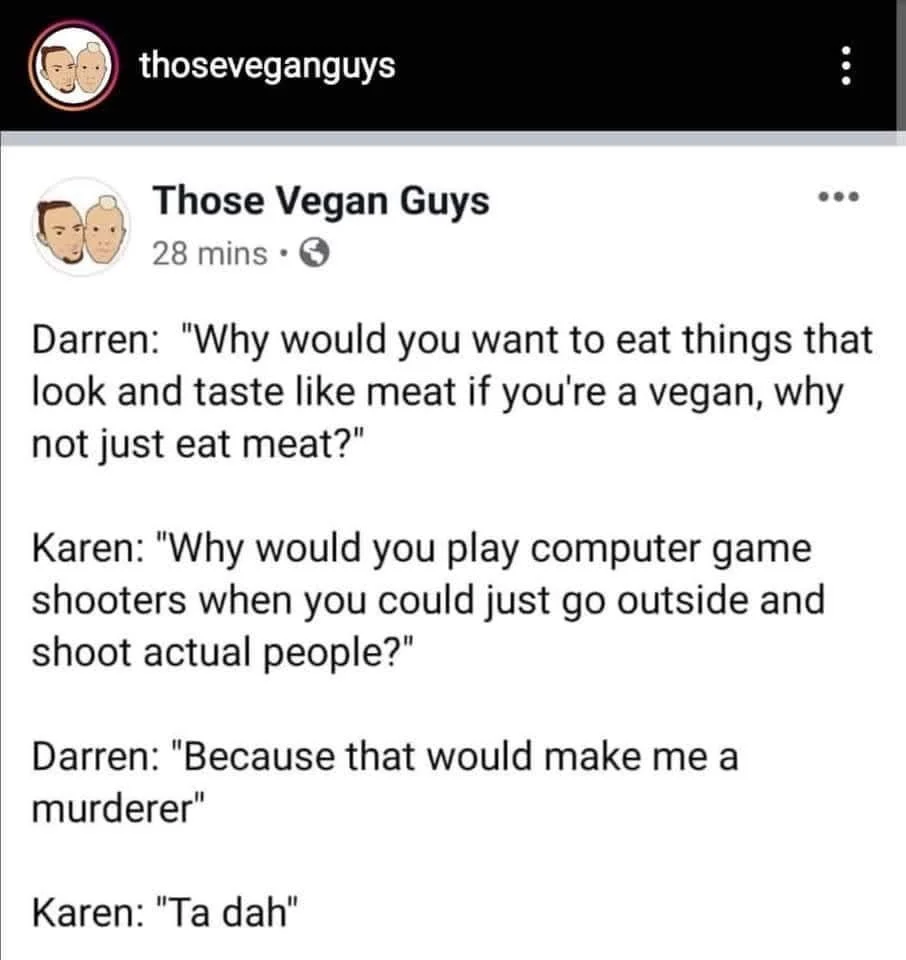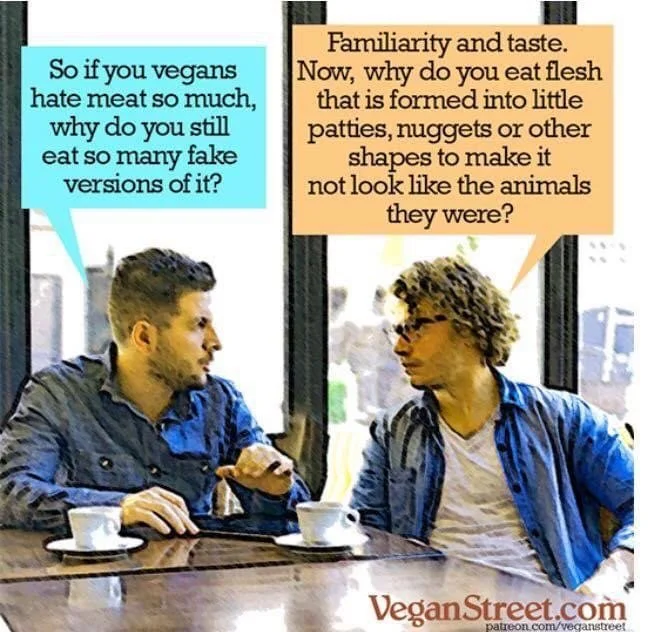 We didn’t go vegan because we didn’t like the taste of meat; we did so because we’re against the cruelty and unnecessary death that is required to make meat and other animal products.